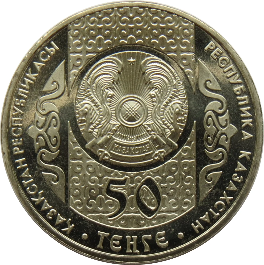 Description: Kazakhstan's Coat of Arms on an ornamental background; face value with "ТЕҢГЕ" below; national ornament elements on the sides; inscriptions "ҚАЗАҚСТАН РЕСПУББЛИКАСЫ" and "РЕСПУБЛИКА КАЗАХСТАН" around the circumference.