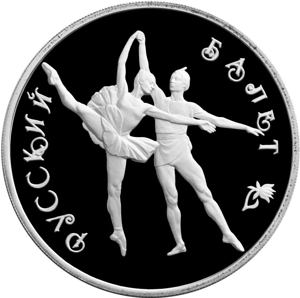 A duet dances within a rim inscribed "РУССКИЙ БАЛЕТ" and a flower.
