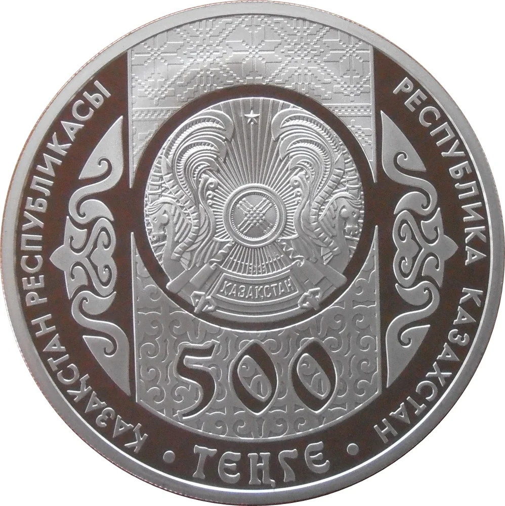 Description: Central Kazakhstan state emblem with Kazakh and Ukrainian ornamentation. Face value and "ТЕҢГЕ" below; national ornaments on sides. Circumferential inscriptions: "ҚАЗАҚСТАН РЕСПУБЛИКАСЫ" and "РЕСПУБЛИКА КАЗАХСТАН". Protruding edge.