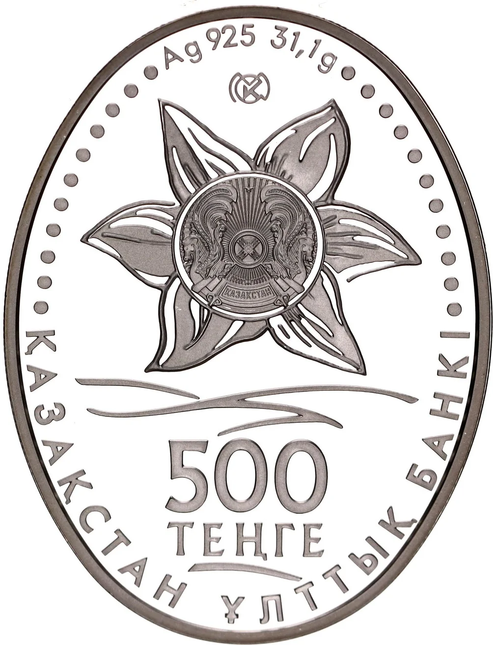 Description: Kazakhstan's coat of arms within a stylized snowdrop petal frame; face value and mint mark. Inscriptions: "ТЕҢГЕ" below, with "ҚАЗАҚСТАН ҰЛТТЫҚ БАНКІ" and "Ag 925 31,1 g" separated by dots. Weight excludes insert and coating.