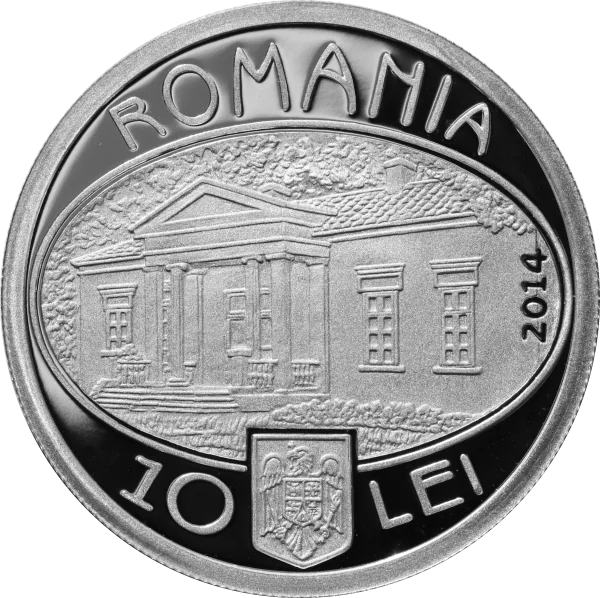 Elena Văcărescu's childhood mansion, year "2014", Romania's coat of arms, face value "10 LEI", and the arched inscription "ROMANIA".