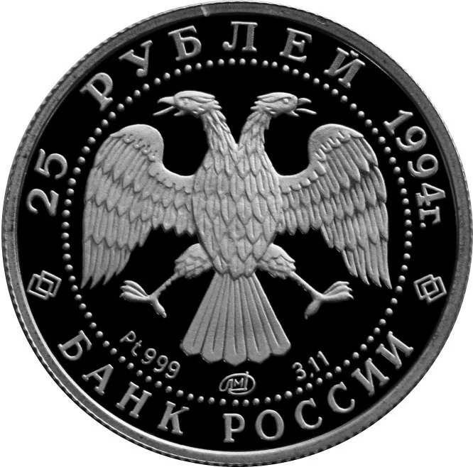 The obverse features I. Bilibin's two-headed eagle, the metal, fineness, mint mark, and weight. The rim is inscribed "25 РУБЛЕЙ 1994 г." above and "БАНК РОССИИ" below.