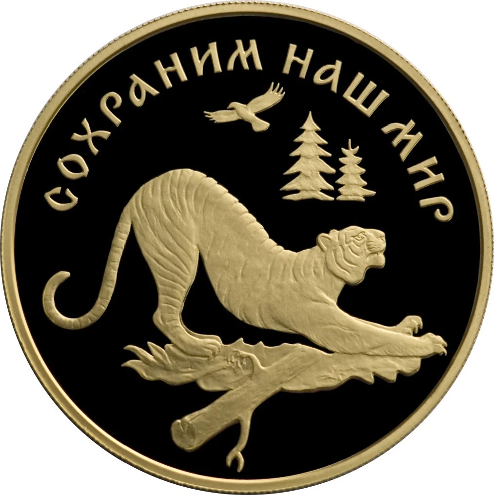 An Amur tiger weighed down, with a bird and firs behind it. Rim inscription: "СОХРАНИМ НАШ МИР" (PROTECT OUR WORLD).