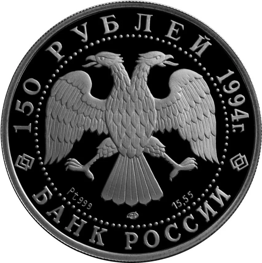 The obverse features I. Bilibin's two-headed eagle, the metal, fineness, mint mark, and fine weight. The rim is inscribed "150 РУБЛЕЙ 1994 г." above and "БАНК РОССИИ" below.