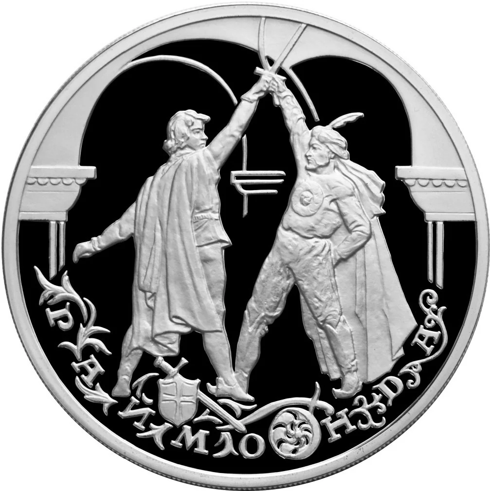 Center: Bank of Russia emblem (I. Bilibin's double-headed eagle) with "БАНК РОССИИ" below. Rim inscriptions: top — "ТРИ РУБЛЯ", bottom — "1999". Left: metal and fineness. Right: fine metal content and mint mark.