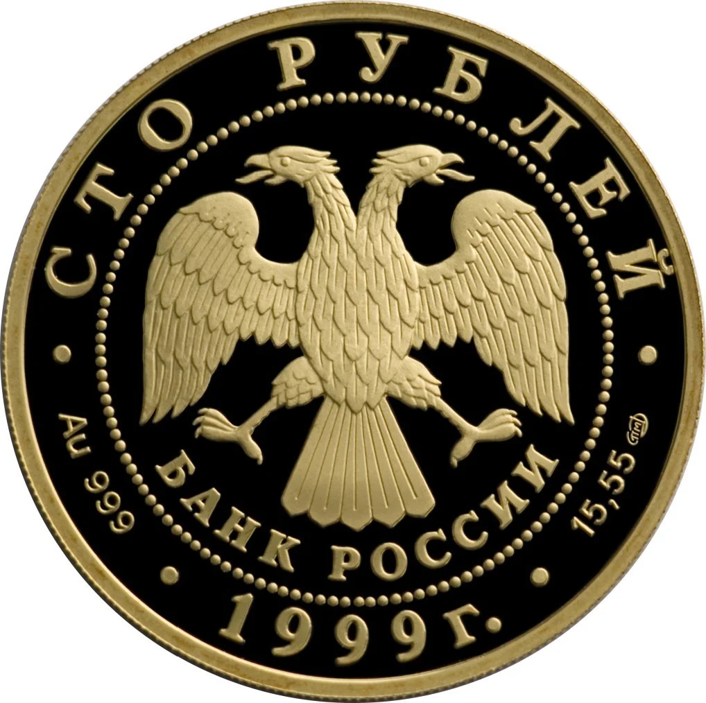 Centered is the Bank of Russia emblem (I. Bilibin's two-headed eagle) above a semicircular "БАНК РОССИИ" inscription, framed by dots. The rim reads "СТО РУБЛЕЙ" above and "1999" below, with metal specifications and the mint mark on the sides.