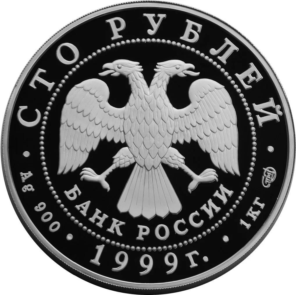 Centered is the Bank of Russia emblem (I. Bilibin's double-headed eagle), below it the semicircular inscription "БАНК РОССИИ" within a dotted circle. The rim inscriptions: top — "СТО РУБЛЕЙ", bottom — "1999". Left of the eagle are the metal and fineness marks, right — the fine metal content and mint mark.