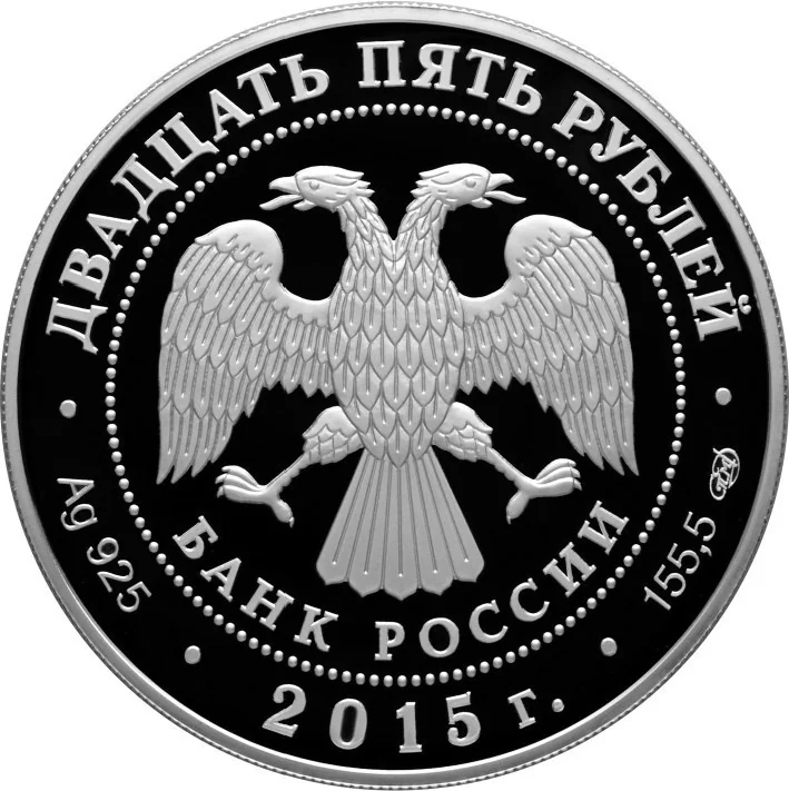 Center: Bank of Russia emblem (two-headed eagle with wings down, "БАНК РОССИИ" below), circled by dots. Rim inscriptions: top – "ДВАДЦАТЬ ПЯТЬ РУБЛЕЙ"; bottom left – metal and fineness, center – "2015 г.", right – metal content and mint mark.