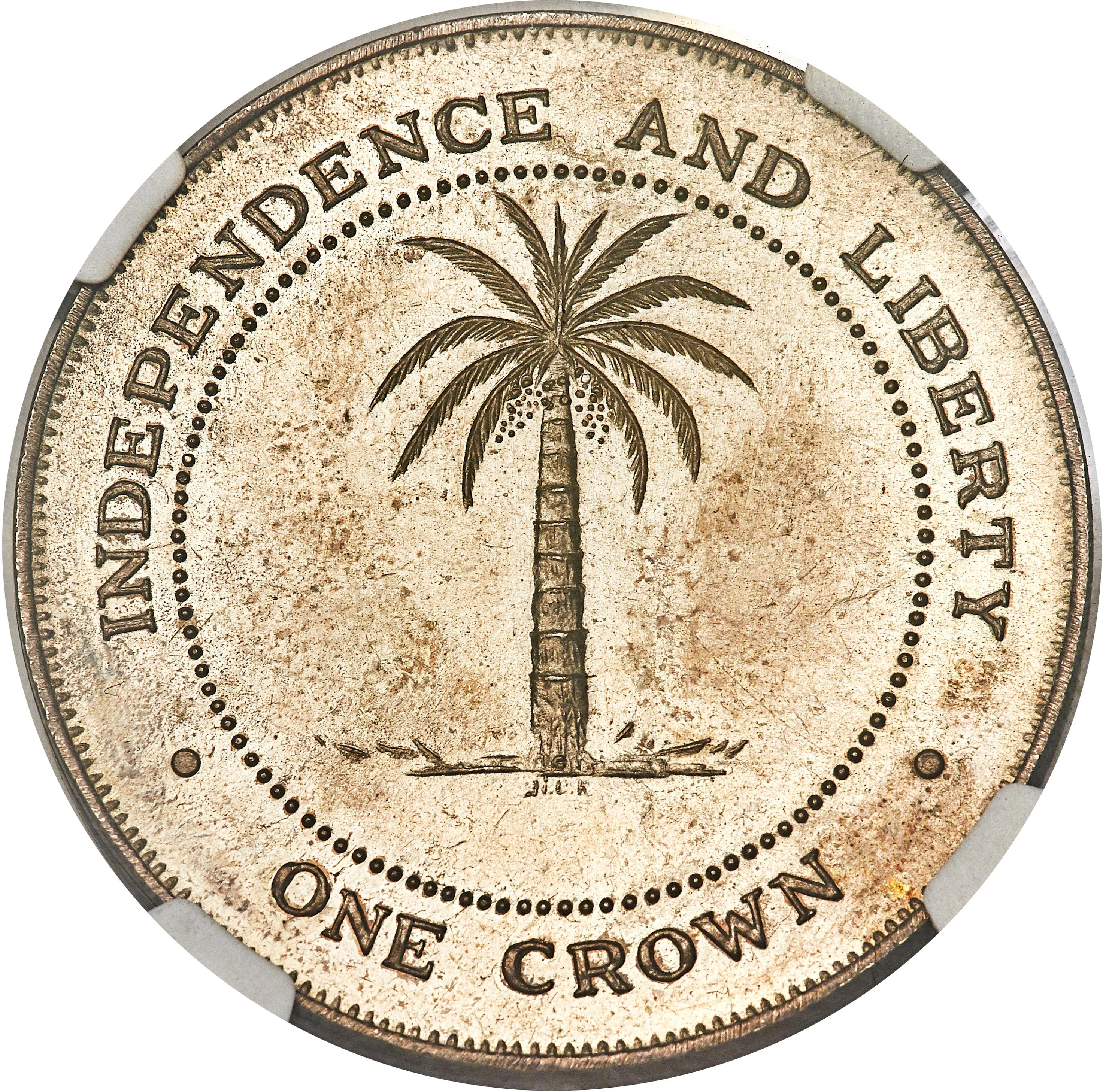 Coconut palm (Cocos nucifera) in beaded circle, motto above, denomination below.