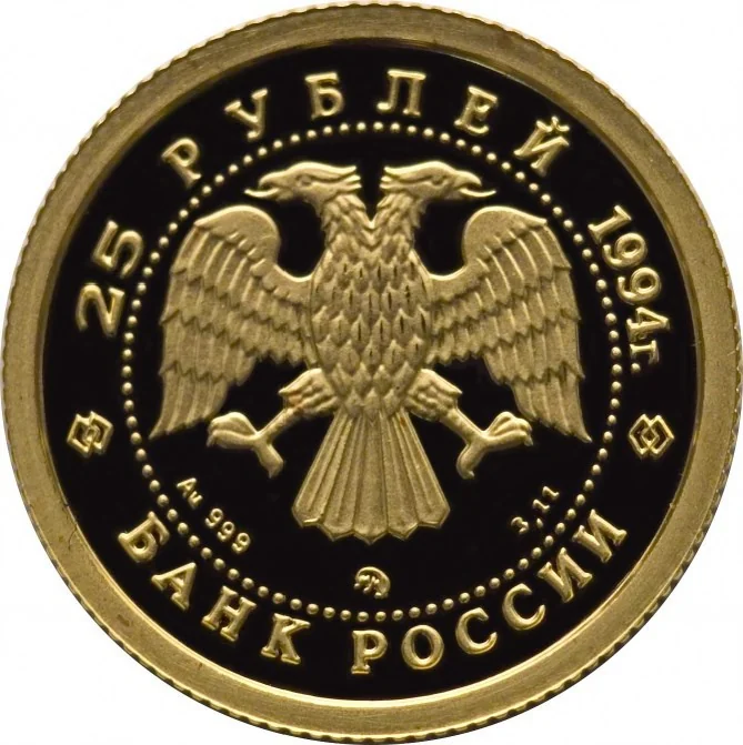 The obverse features I. Bilibin's two-headed eagle, the metal, fineness, mint mark, and fine weight. The rim is inscribed "25 РУБЛЕЙ 1994 г." above and "БАНК РОССИИ" below.