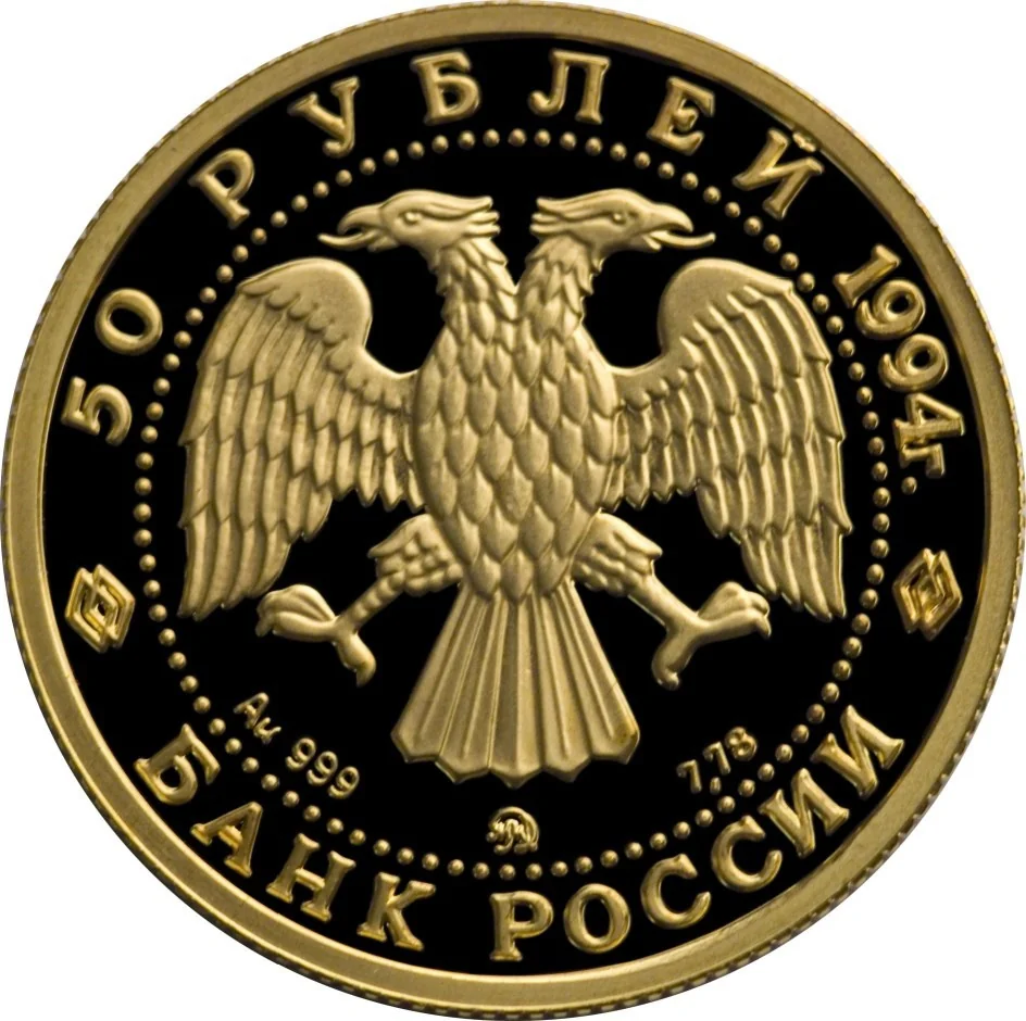 The obverse features I. Bilibin's two-headed eagle, the metal, fineness, mint mark, and fine weight. The rim is inscribed "50 РУБЛЕЙ 1994 г." above and "БАНК РОССИИ" below.