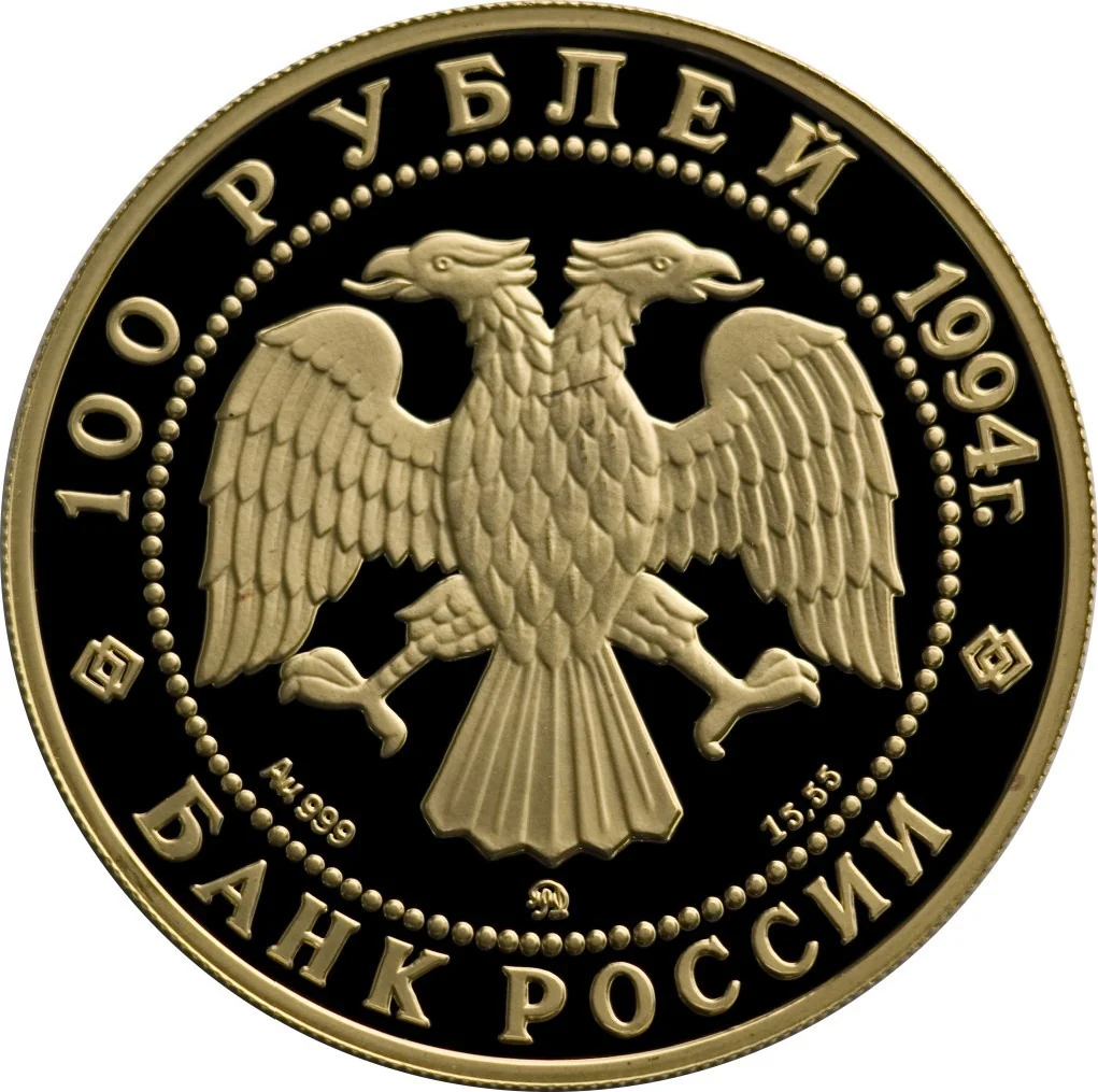 The obverse features I. Bilibin's two-headed eagle, the metal, fineness, mint mark, and fine weight. The rim is inscribed "100 РУБЛЕЙ 1994 г." at the top and "БАНК РОССИИ" at the bottom.