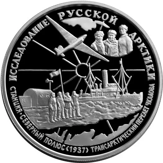 Description: Top: An aircraft over an Arctic coast map. Right: Portraits of Chkalov, Baidukov, and Belyakov. Center: An icebreaker and polar explorers Papanin, Fedorov, Shirshov, and Krenkel on an ice floe. Rim inscriptions: Top - "ИССЛЕДОВАНИЕ РУССКОЙ АРКТИКИ", Bottom - "СТАНЦИЯ 'СЕВЕРНЫЙ ПОЛЮС' <1937> ТРАНСАРКТИЧЕСКИЙ ПЕРЕЛЕТ ЧКАЛОВА".