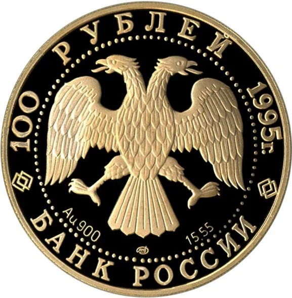 Centered is the Bank of Russia emblem (I. Bilibin's two-headed eagle), below it are the metal specifications and mint mark. Around the rim, within a dotted circle: at the top — "100 РУБЛЕЙ 1995 г.", at the bottom — "БАНК РОССИИ".