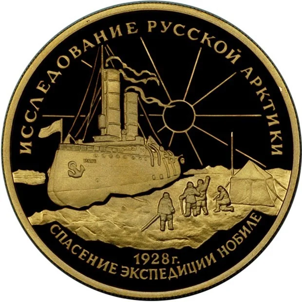 Center: the icebreaker *Krasin*. Right: people and a tent on an ice floe. Below: the date "1928". Rim inscriptions: top—"EXPLORATION OF RUSSIAN ARCTIC", bottom—"THE RESCUE OF NOBILE'S EXPEDITION".