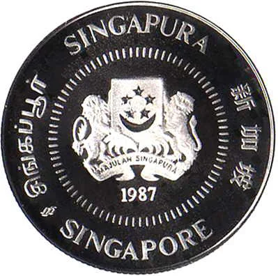 Emblem with date; 'Singapore' encircles it in English, Tamil, Chinese, and Malay.