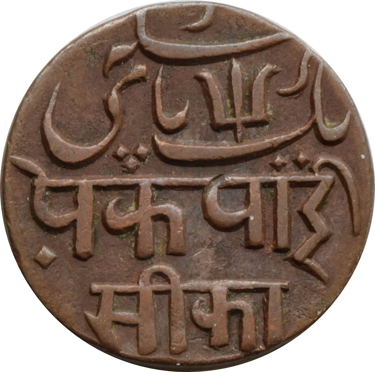 Value in two scripts: Persian (یک پَی سِکّه), Devanagari (एक पै सिक्का).