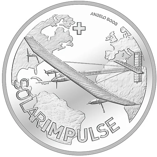 Solar Impulse aircraft flying left over an Atlantic map with Americas, Europe, Africa, and a Swiss cross.