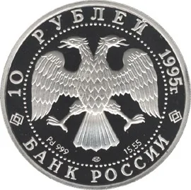 Central design: Bank of Russia emblem (I. Bilibin's two-headed eagle), with metal specifications below. Circular inscription: "10 РУБЛЕЙ 1995 г." above, "БАНК РОССИИ" below, within a dotted border.