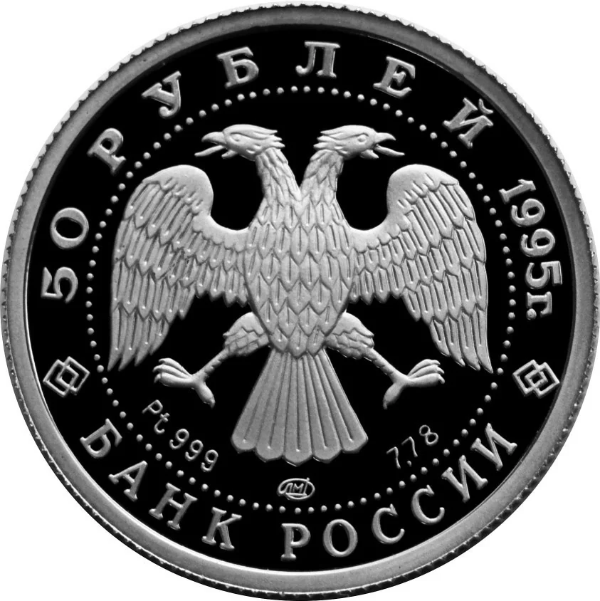 Description: Centered is the Bank of Russia emblem (I. Bilibin's two-headed eagle), below it are the metal, fineness, mint mark, and weight. Around the rim, within a dotted circle: "50 РУБЛЕЙ 1995 г." above and "БАНК РОССИИ" below.