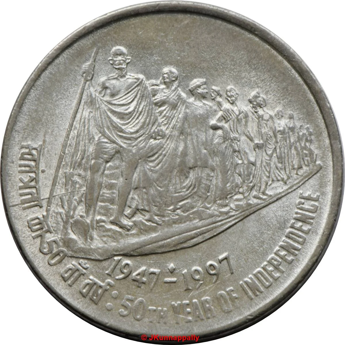 Gandhi with staff, leading people. Mintmarks: ♦ (Mumbai), none (Calcutta), * (Hyderabad), M (Mumbai proofs), ° (Noida).