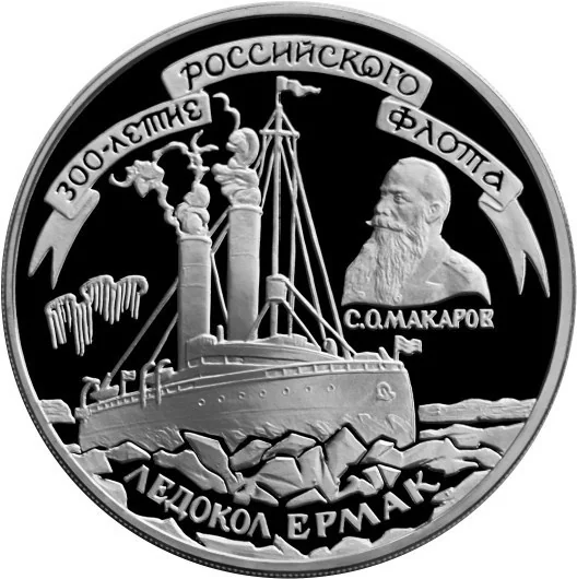 Left: the icebreaker Yermak. Right: a portrait of Admiral Stepan Makarov, inscribed "С.О. МАКАРОВ". Rim inscriptions: top, "300-ЛЕТИЕ РОССИЙСКОГО ФЛОТА"; bottom, "ЛЕДОКОЛ 'ЕРМАК'".