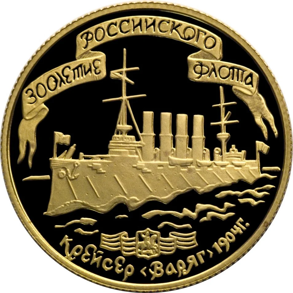 Cruiser "VARYAG" with its coat of arms. Inscriptions: above, "300TH ANNIVERSARY OF THE RUSSIAN FLEET"; below, "CRUISER 'VARYAG' 1904".