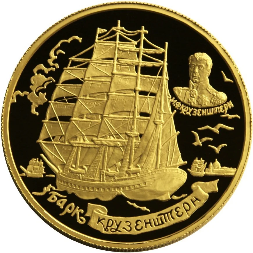 The stern of the barque "Krusenstern," featuring a portrait of I.F. Krusenstern with his name inscribed around it. Below, a ribbon reads: "THE BARQUE «KRUSENSTERN»."