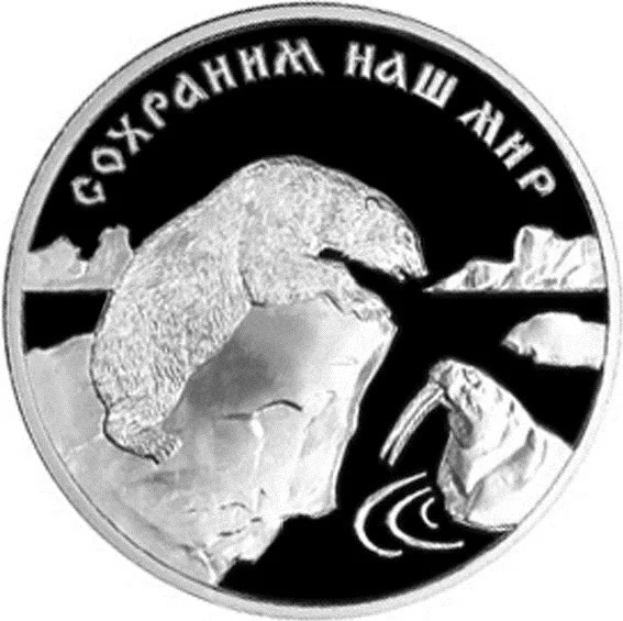 Polar bear hunting a walrus on an ice floe, encircled by "СОХРАНИМ НАШ МИР" (PROTECT OUR WORLD).