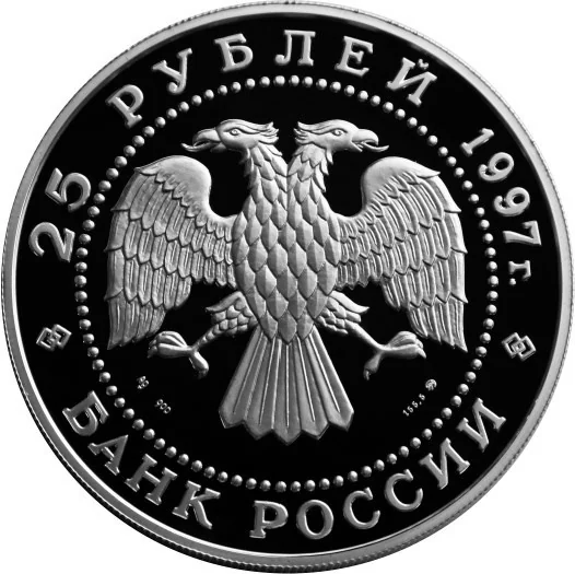 I. Bilibin's two-headed eagle design. Rim inscriptions: top — "25 РУБЛЕЙ 1997", bottom — "БАНК РОССИИ". Letters below indicate metal, fineness, weight, and mint mark.