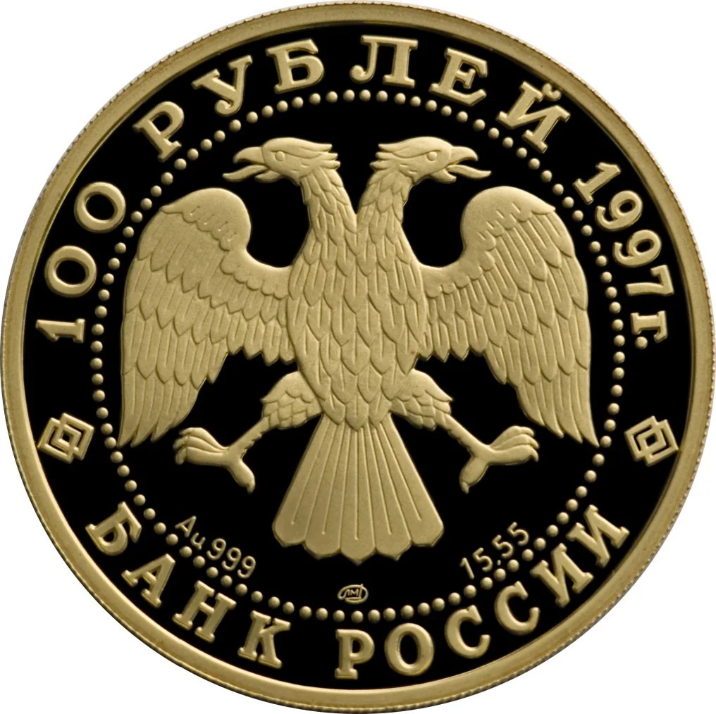 I. Bilibin's two-headed eagle design. Rim inscriptions: top—"100 РУБЛЕЙ 1997" (100 ROUBLES 1997), bottom—"БАНК РОССИИ" (BANK OF RUSSIA). Letters below denote the metal, fineness, weight, and mint mark.