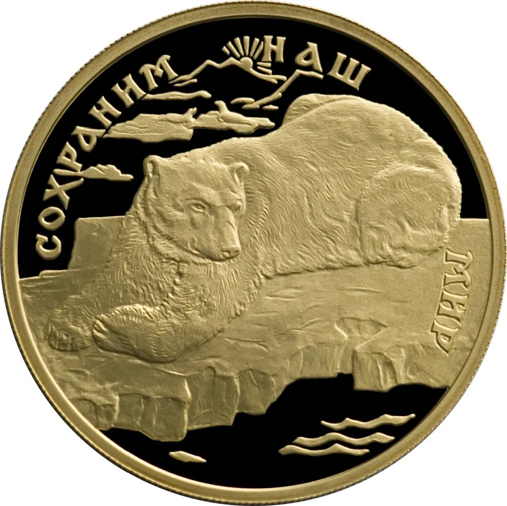 Polar bear on an ice floe with the rim inscription: "СОХРАНИМ НАШ МИР" (PROTECT OUR WORLD).
