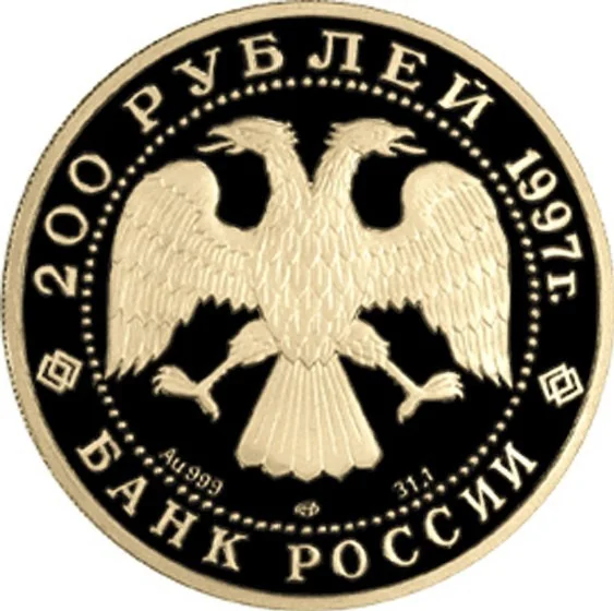 Artist I. Bilibin's two-headed eagle design. Rim inscriptions: "200 РУБЛЕЙ 1997 г." (top) and "БАНК РОССИИ" (bottom). Letters below denote metal, fineness, weight, and mint mark.