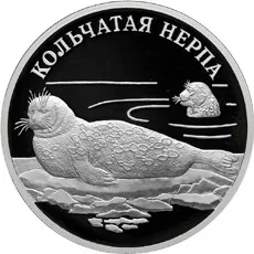 A Ringed Seal rests on an ice floe, with another surfacing behind it. The rim is inscribed: «КОЛЬЧАТАЯ НЕРПА» (RINGED SEAL).