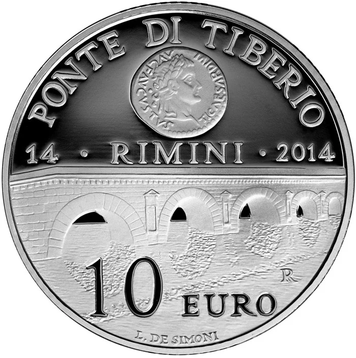 Five-arched stone bridge over the Mediterranean, reflecting like a Tiberius coin.