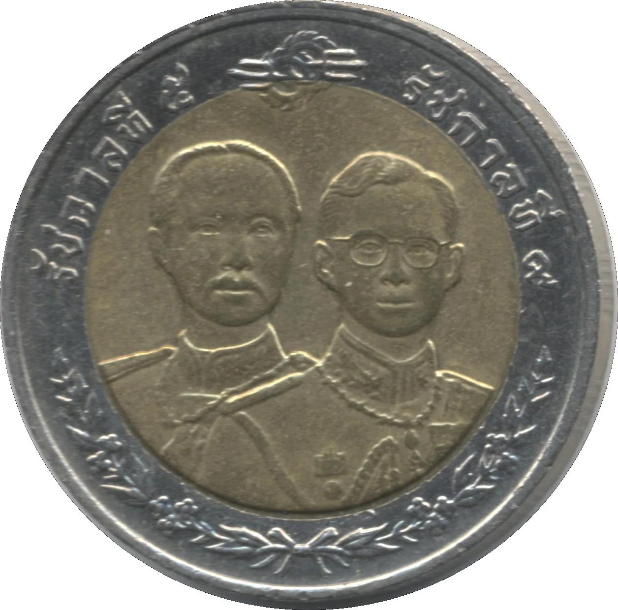 Conjoined busts of Kings Chulalongkorn and Bhumibol Adulyadej, facing forward, with two crossing Chakri emblems above.