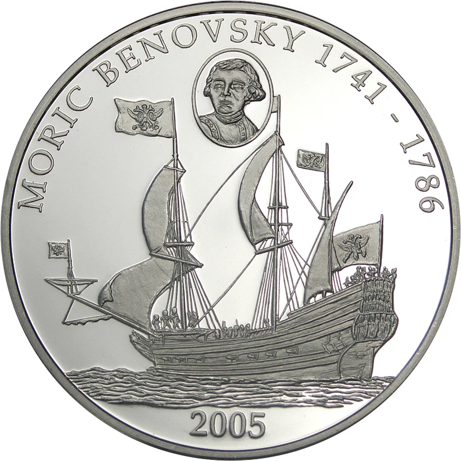 Bust of Moric Benovsky in an oval medallion above a sailing ship.