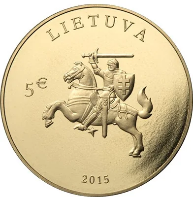 The obverse features a stylised Vytis, with the inscriptions LIETUVA, €5, and 2015.