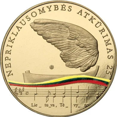 The reverse shows a boat with a bird-wing sail, the Lithuanian flag, a fragment of the national anthem, and the inscription NEPRIKLAUSOMYBĖS ATKŪRIMAS 25 in a semicircle, along with the mintmark.