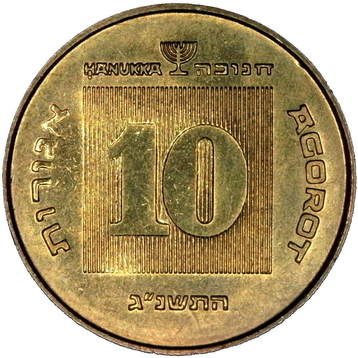 "10" on a square; "Agorot" in Hebrew and English; the Hebrew date; "Hanukka" in Hebrew and English flanking a small candelabrum.