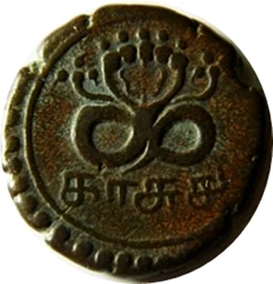 Trident above Tamil date (Malayalam era 991), within beaded circle. This corresponds to 1816 AD (991 + 825).