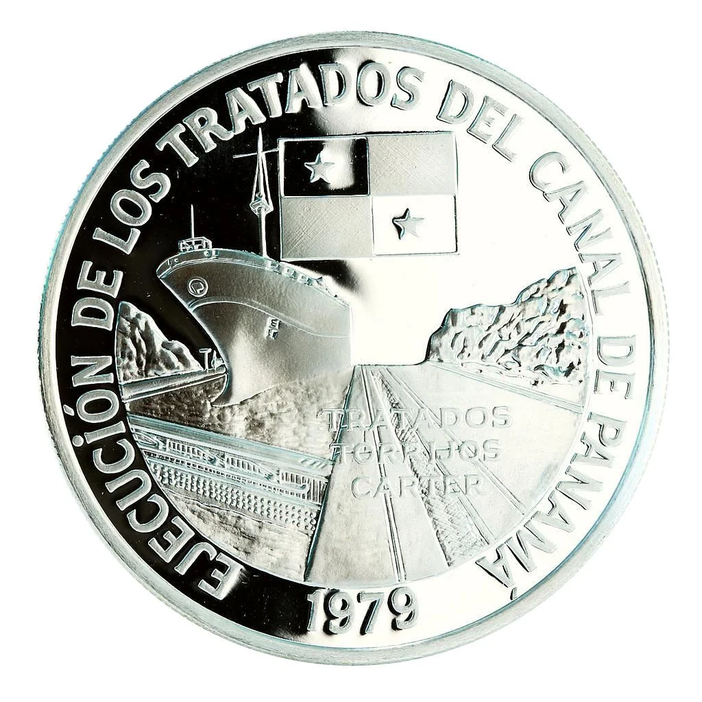 Ship in canal lock, Panamanian flag above, legend around, date below.