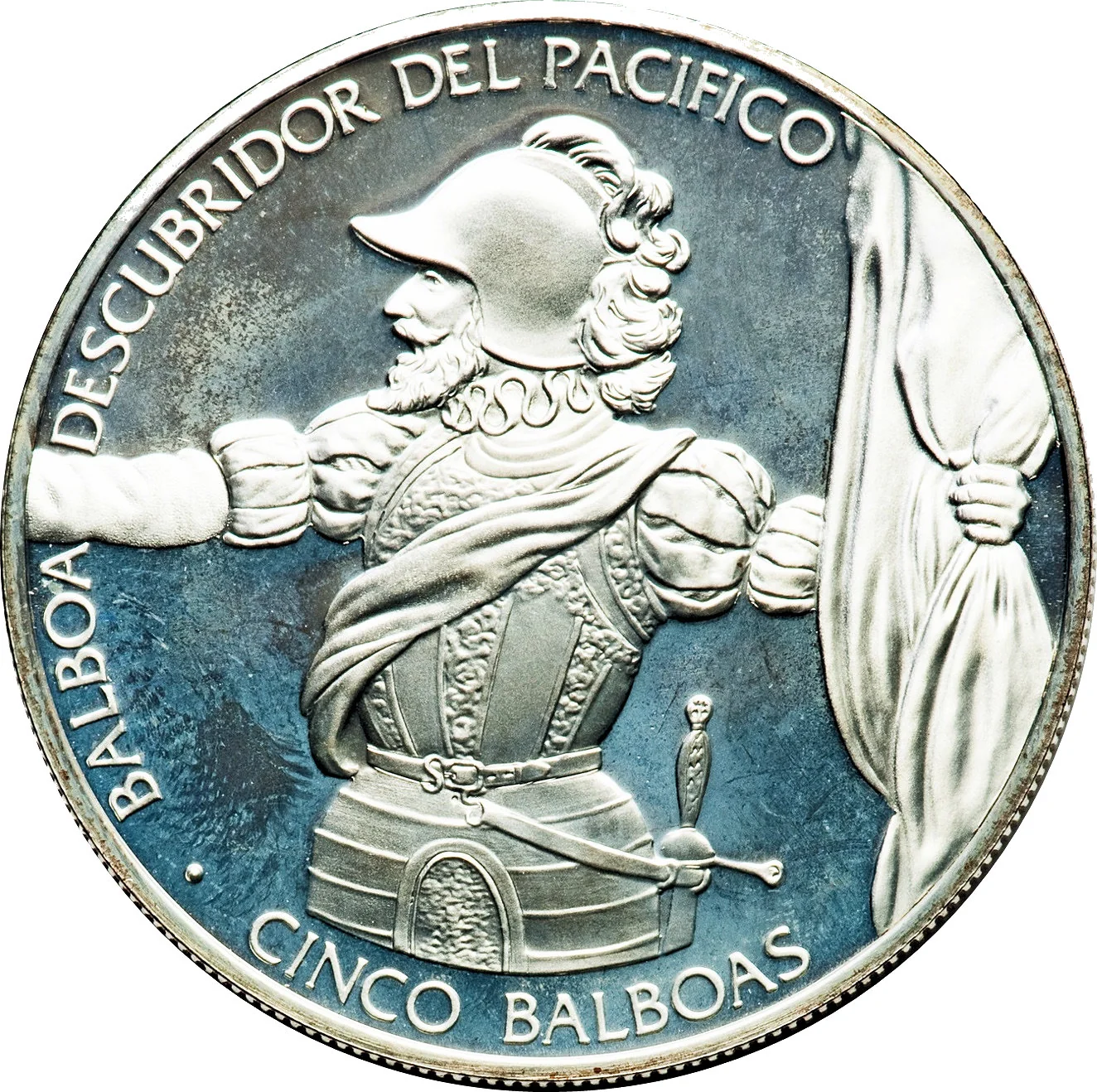 Armored bust of Vasco Núñez de Balboa facing left, holding a folded flag. Legend surrounds, value below.