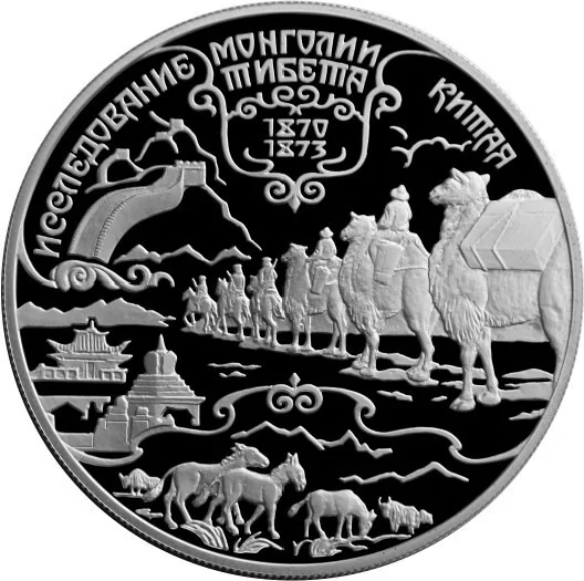 An expedition caravan, the Great Wall, a pagoda, and a Buddhist shrine, with kulans and yaks below. The rim inscription reads: "ИССЛЕДОВАНИЕ МОНГОЛИИ, КИТАЯ, ТИБЕТА" and the dates "1870" "1873".