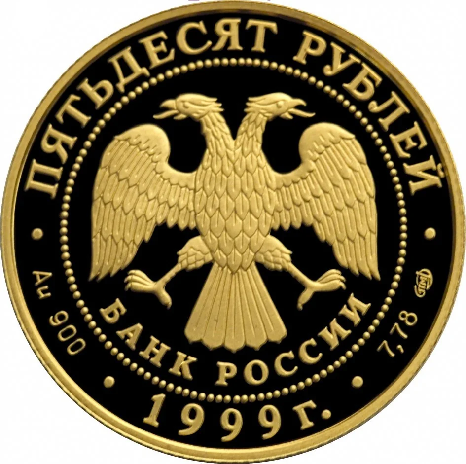 Centered is the Bank of Russia emblem (I. Bilibin's double-headed eagle), below it "БАНК РОССИИ" within a dotted circle. The rim inscriptions: top — "ПЯТЬДЕСЯТ РУБЛЕЙ", bottom — "1999". Left of the eagle are the metal and fineness marks, right — the fine metal content and mint mark.