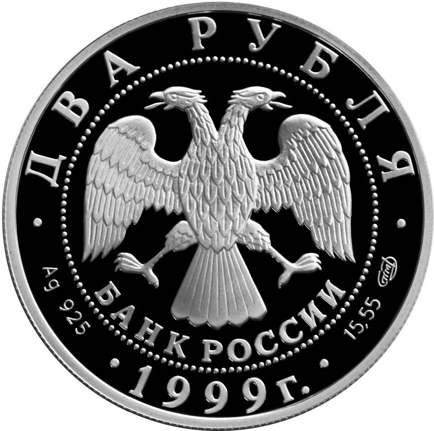 Center: Bank of Russia emblem (I. Bilibin's double-headed eagle) with "БАНК РОССИИ" below. Rim inscriptions: top — "ДВА РУБЛЯ", bottom — "1999". Left: metal and fineness. Right: fine metal content and mint mark.