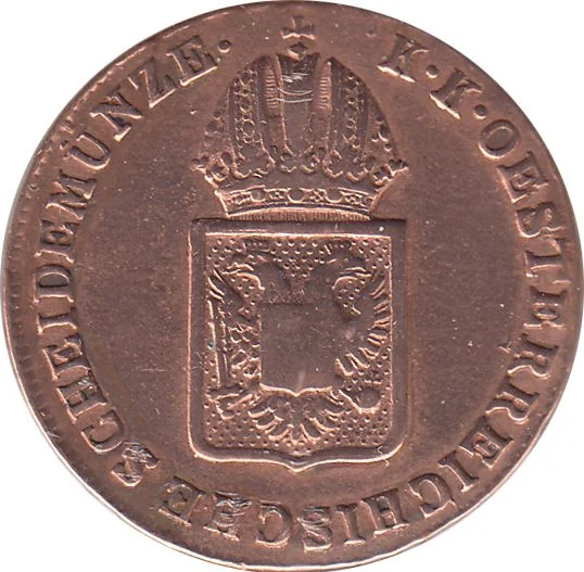 Imperial double-headed eagle on a crowned shield, with Austrian arms on its breast. Surrounding legend: "Kaiserliche und Königliche Östereichische Scheidemünze" (a low-value subsidiary coin).