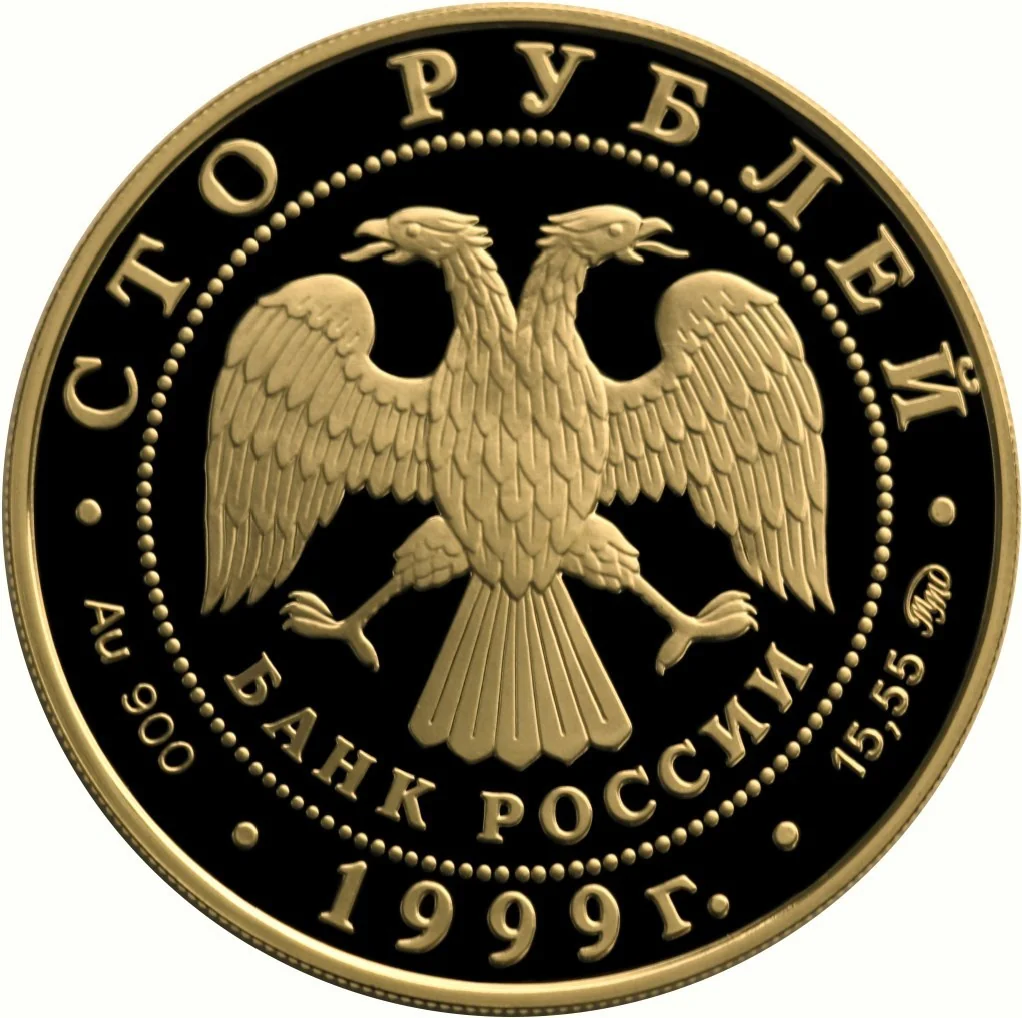 Centered is the Bank of Russia emblem (I. Bilibin's double-headed eagle) above a semicircular "БАНК РОССИИ" inscription, ringed by dots. The rim reads "СТО РУБЛЕЙ" at the top and "1999" at the bottom. Left inscriptions indicate metal and fineness; right inscriptions show fine metal content and the mint mark.