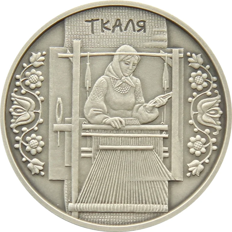 A woman weaves at a loom. Above, on a stylized linen background, is the legend "ТКАЛЯ." Floral patterns frame the central scene.
