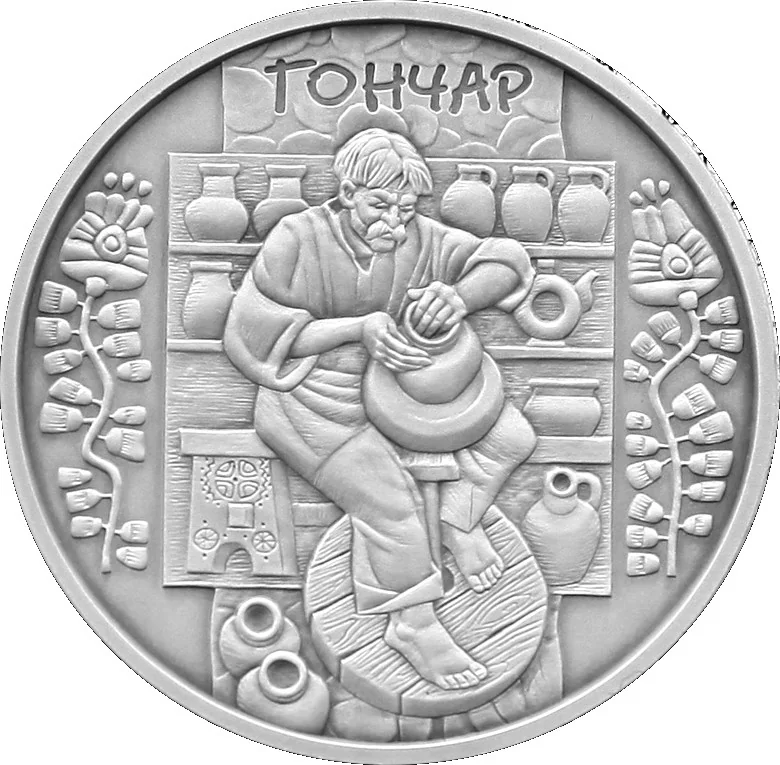 A potter at work, framed by stylized pottery and floral patterns, with the legend "ГОНЧАР" above.